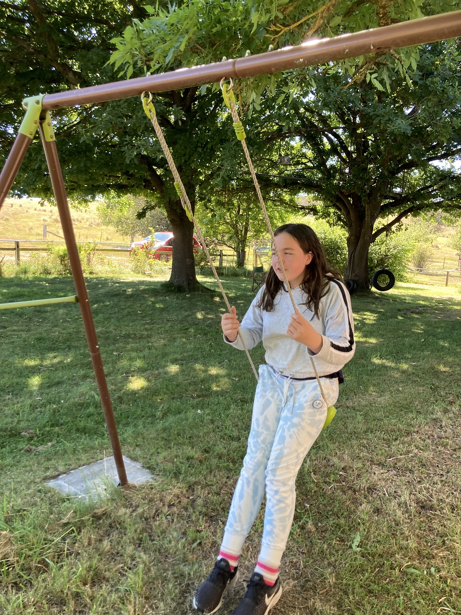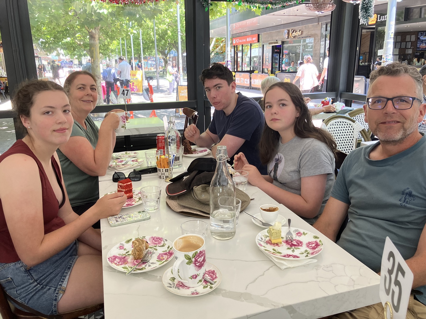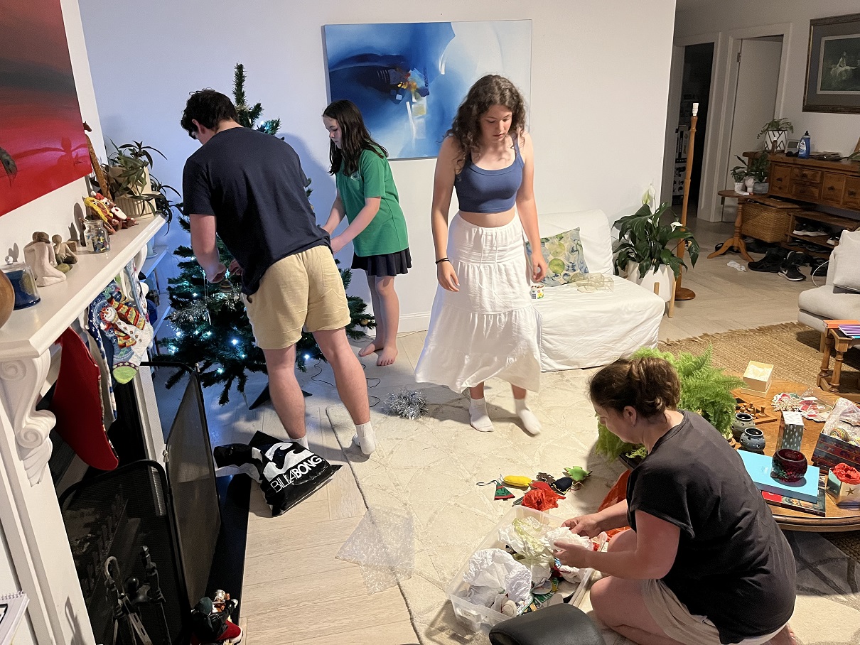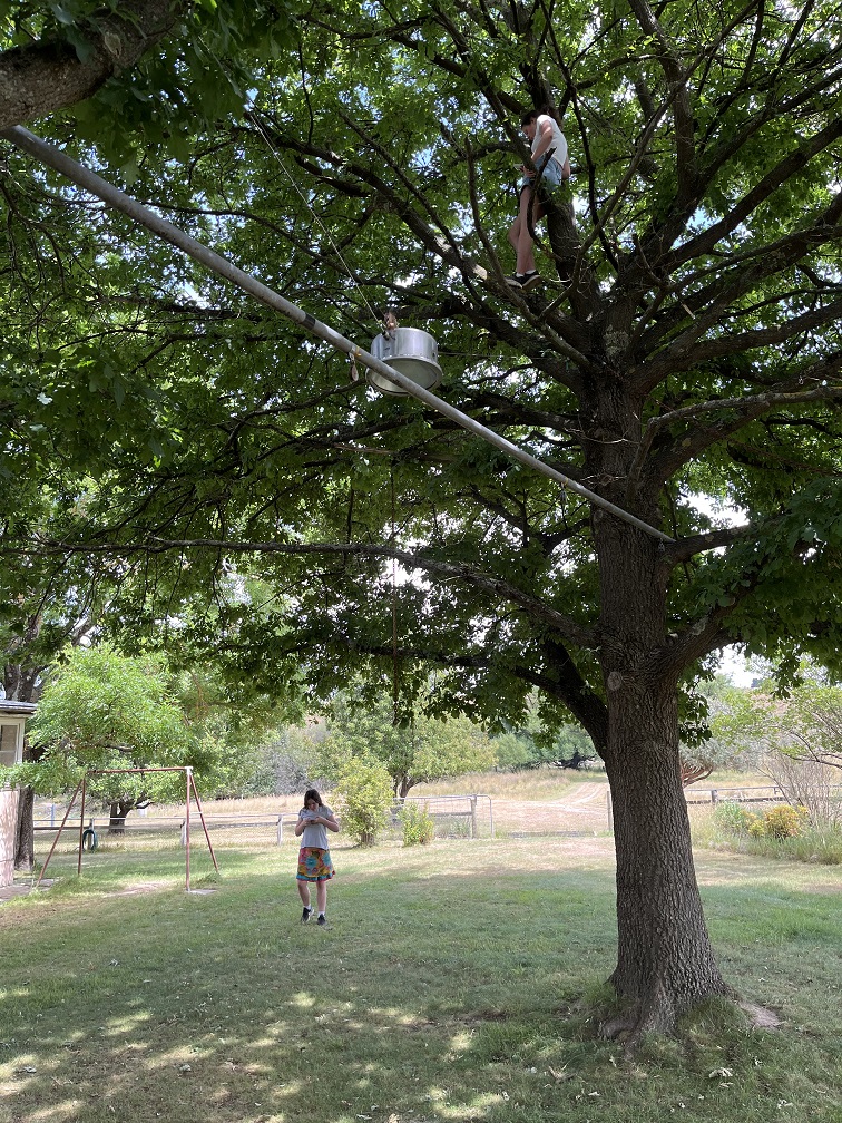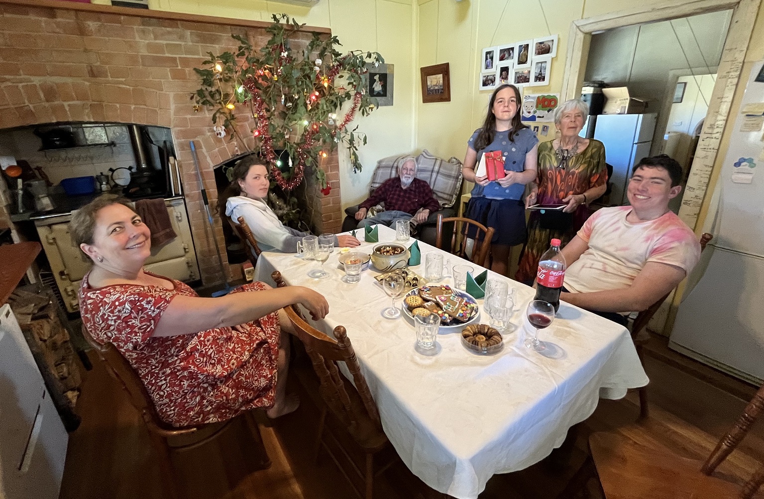 Cutting the Omneo gum tree branch was a communal affair. The kids unwrapped their stocking presents in late morning - how long will we continue this? We had had no energy to put up the fly tent for a single day, but flies were too numerous to eat outside. The kitchen fitted the seven of us for lunch. We unwrapped the remaining presents found under the gum tree branch afterwards. Us five posed for a Christmas greeting picture, played outside in the oak tree (which mum used to jump over when she was young) and on the swing, but especially spent a lot of time on our phones (Piet and Emma) or book (Juliana).