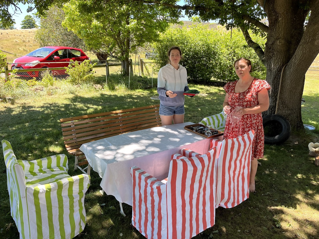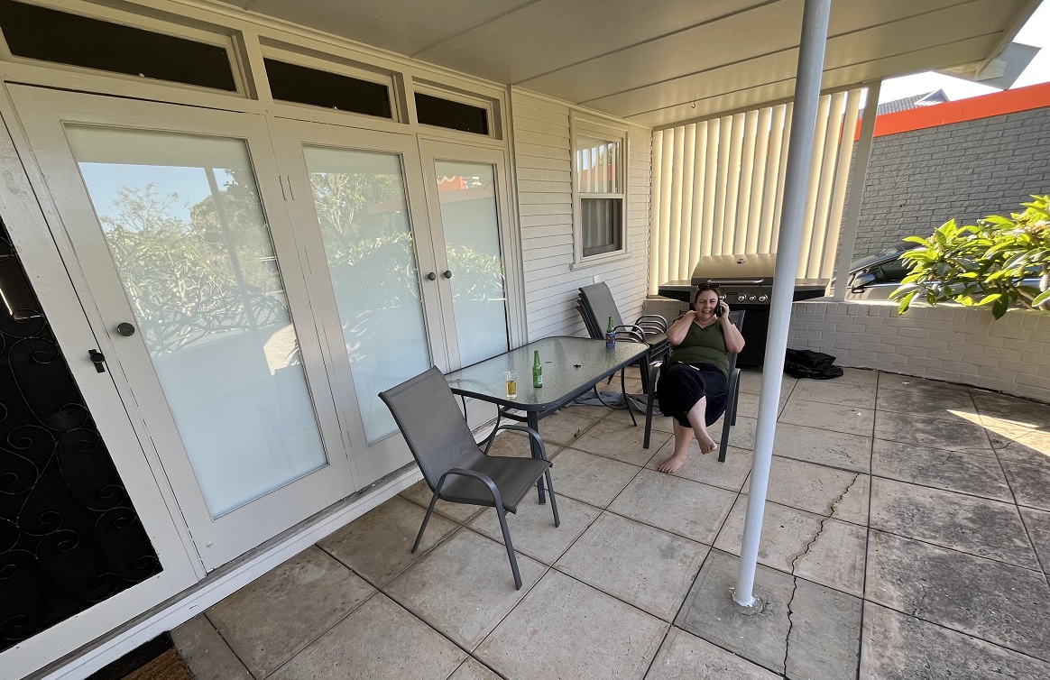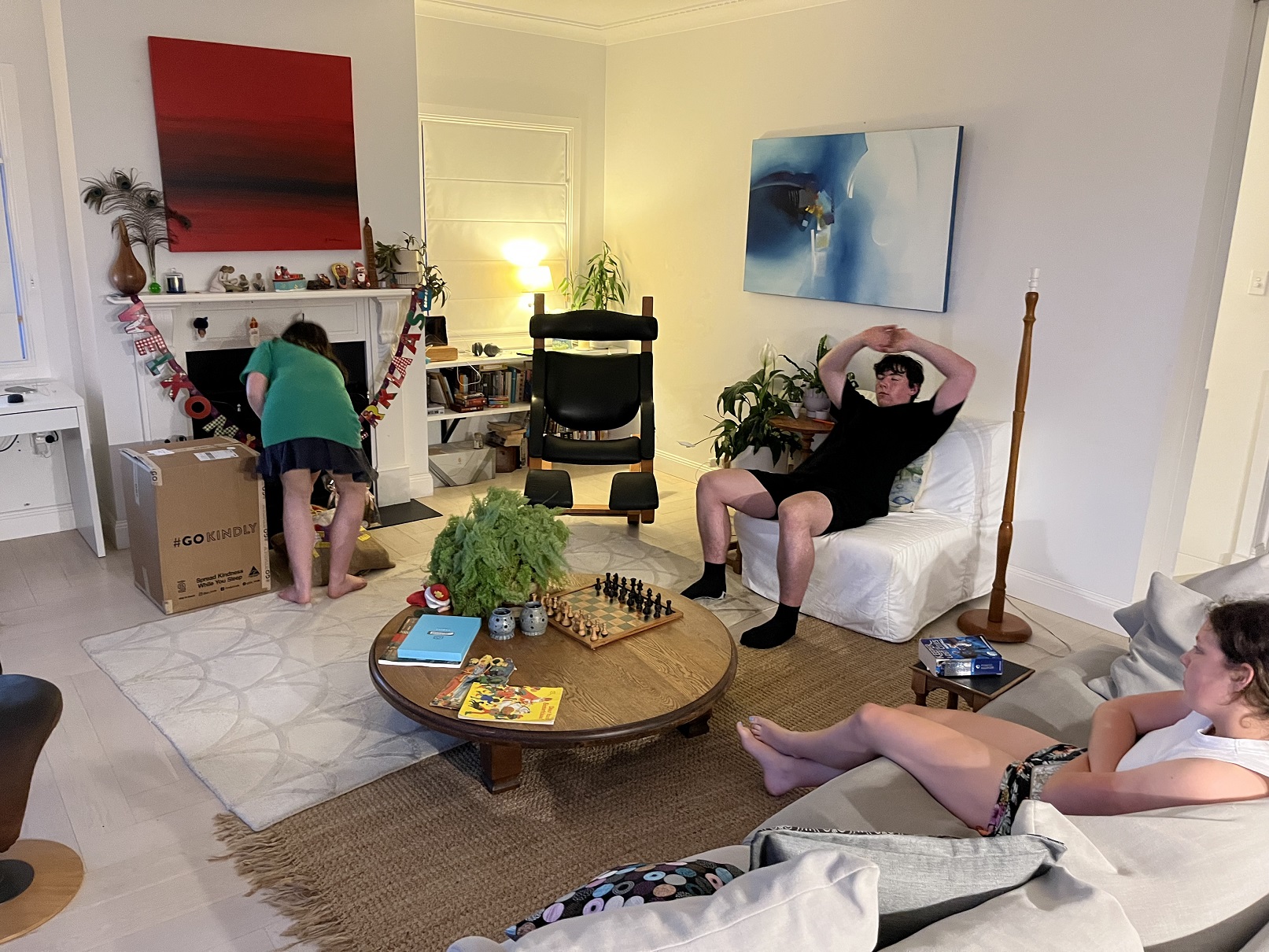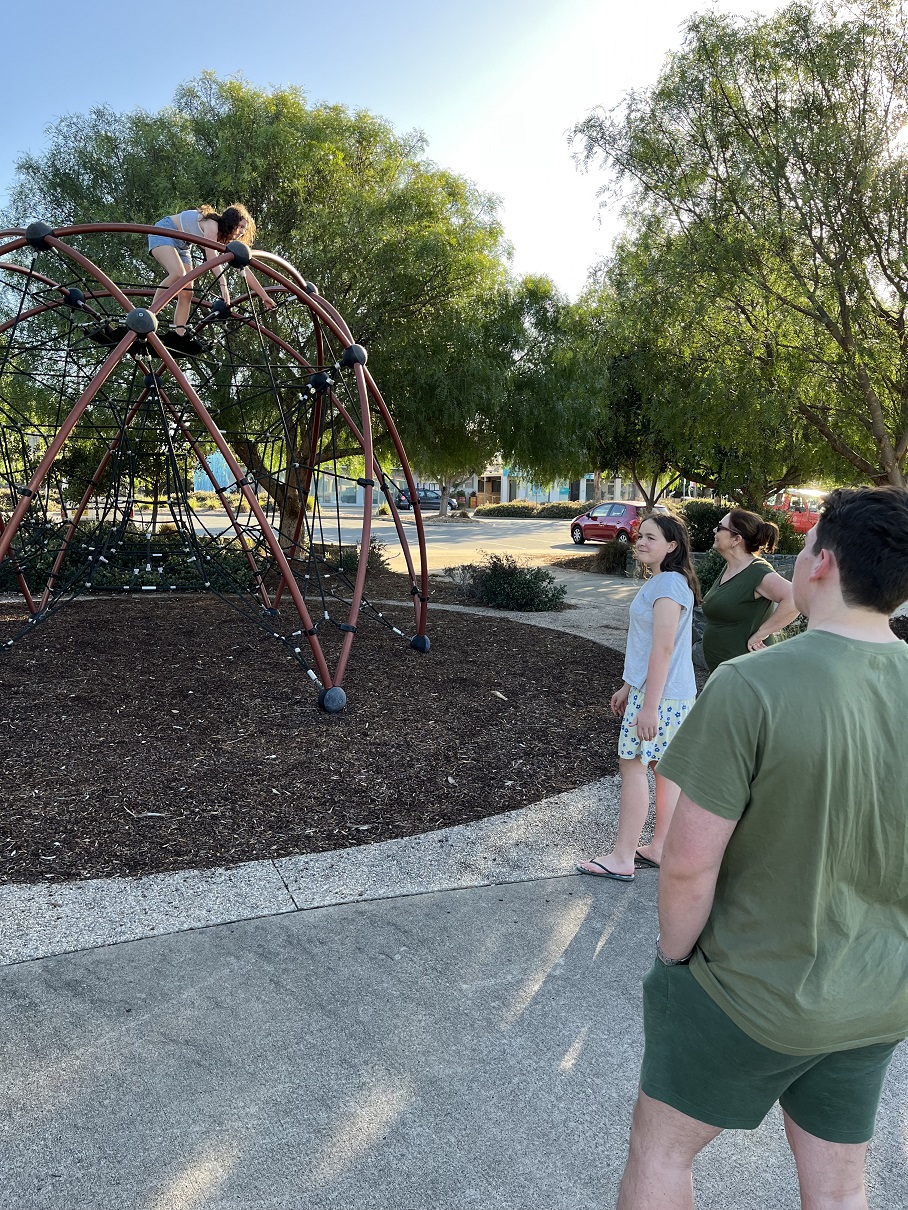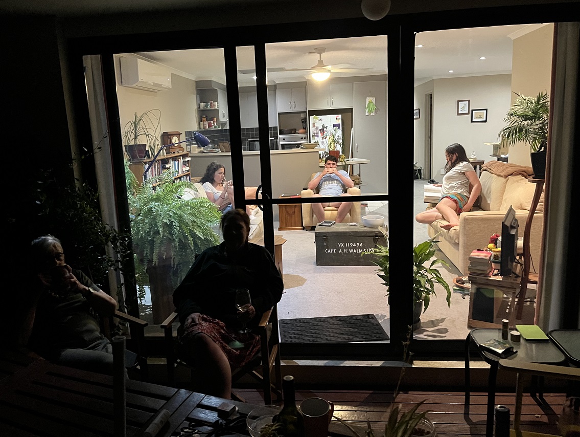 dinner, the adults enjoy the cool Canberra evening, eldest two were on their phones, while Juliana read.