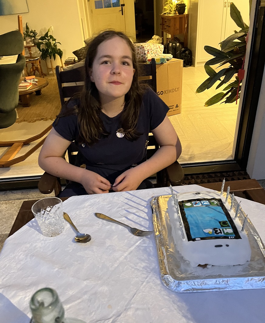 No birthday has been looked forward to as much as Juliana's 11th birthday. In line with Dutch social conventions, she received her own mobile phone, passed down from her sister, who got her dad's, who got a new one (an iPhone 13). Appropriately, mum's cake reflected the mobile phone theme. Juliana is not into birthdays, not organising her own party and even skipping a friend's party, as she feels socially awkward as such events, as she articulates it.