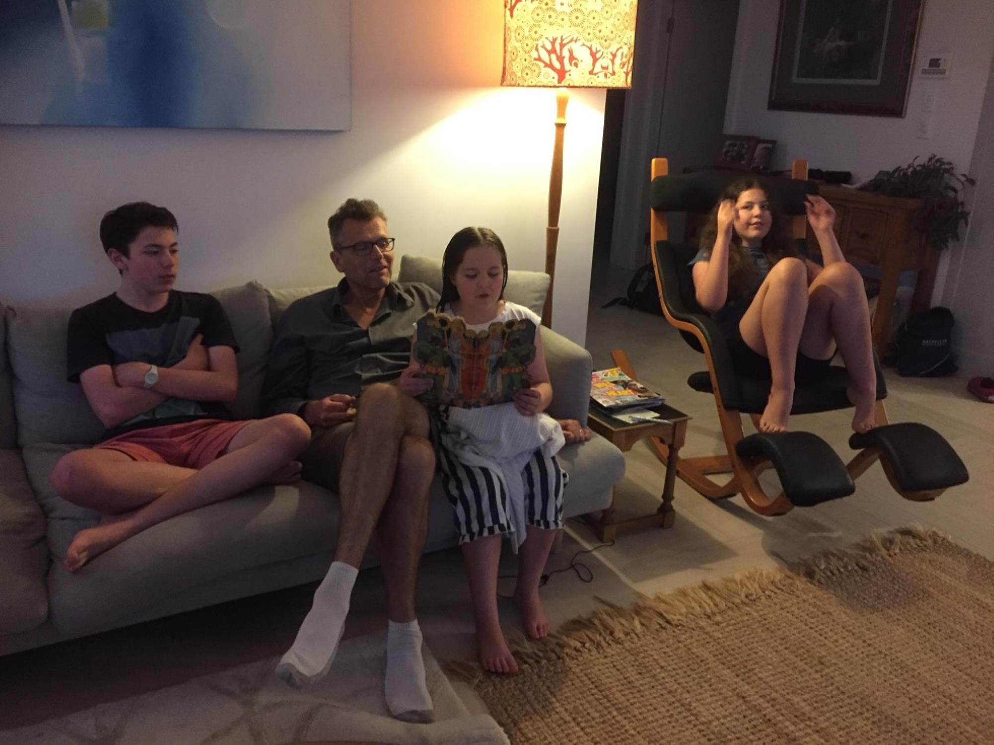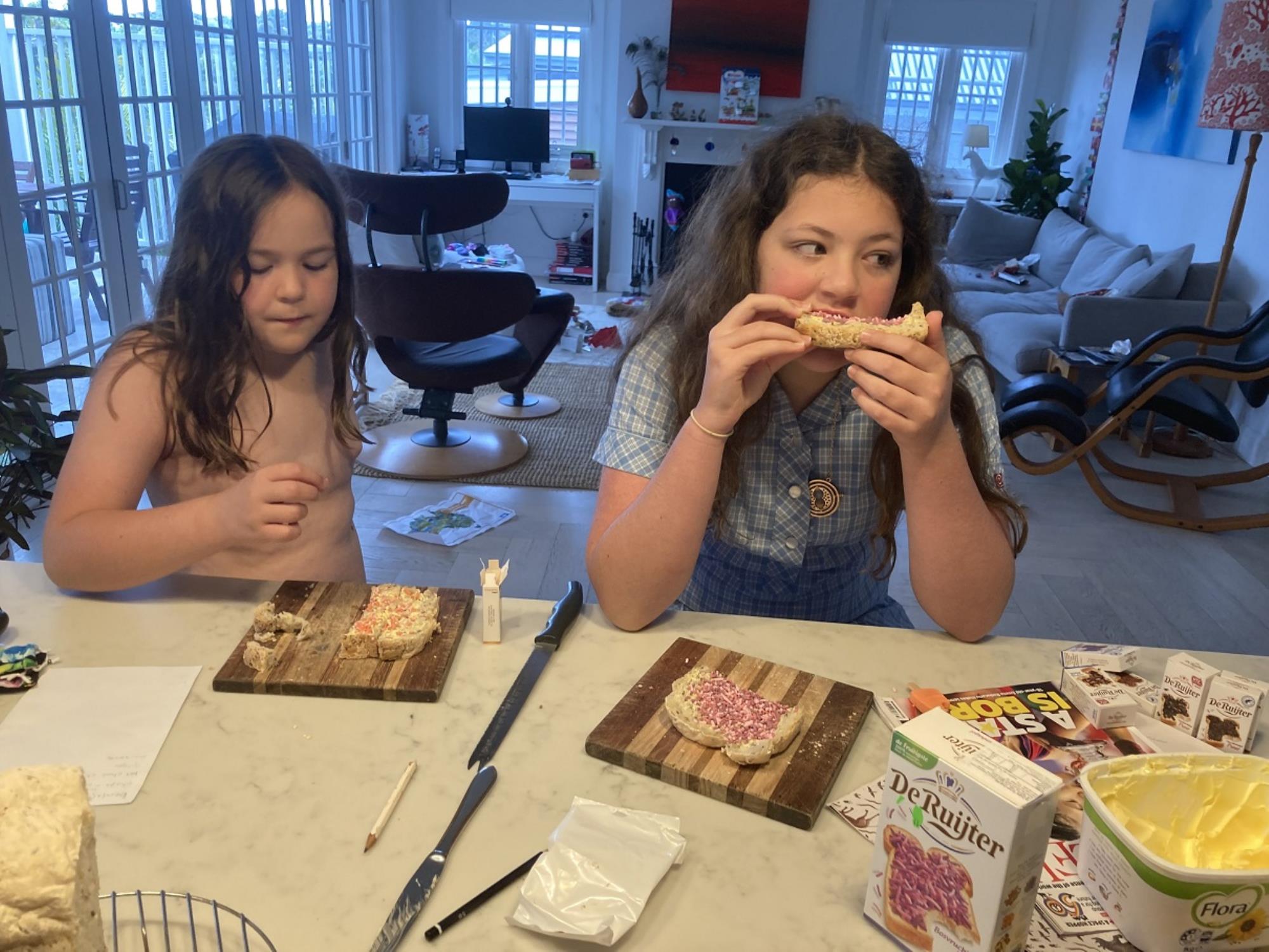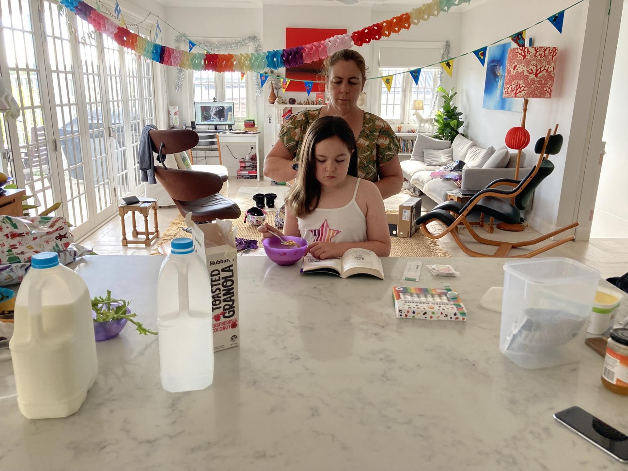 Brushing hair and putting it up for school - a morning ritual - while Juliana is reading and having breakfast